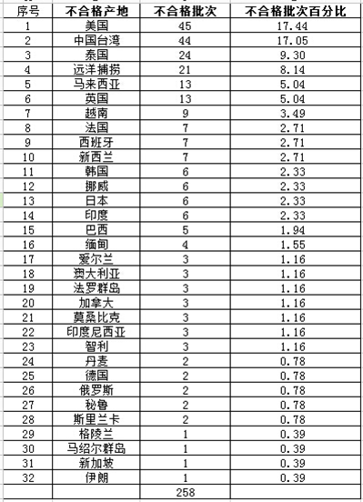 分析顯示,美國、中國臺灣在不合格進境肉制品名單中共有89批次,占不合格進境肉制品批次的34.49%,超過總量的1/3。