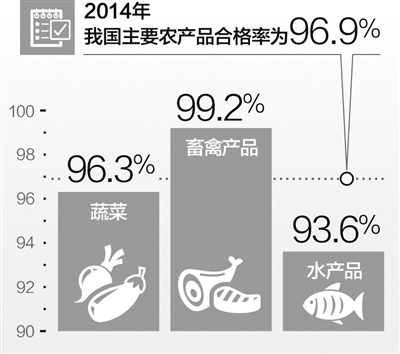 據(jù)介紹,2014年,農(nóng)業(yè)部組織開展了4次農(nóng)產(chǎn)品質(zhì)量安全例行監(jiān)測(cè),共監(jiān)測(cè)全國31個(gè)省(區(qū)、市)151個(gè)大中城市5大類產(chǎn)品117個(gè)品種94項(xiàng)指標(biāo),抽檢樣品43924個(gè),總體合格率為96.9%。其中,蔬菜、畜禽產(chǎn)品和水產(chǎn)品監(jiān)測(cè)合格率分別為96.3%、99.2%和93.6%,水果、茶葉合格率分別為96.8%和94.8%,農(nóng)產(chǎn)品質(zhì)量安全水平保持穩(wěn)定。