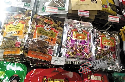 超市中銷售的老四川“三鼎精制牛肉干”。