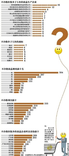 根據新京報統計,自今年1月1日至11月26日,國家食藥監(jiān)總局在“總局公告”里公布了3600余批次不合格食品,有具名的“生產企業(yè)”2293家。根據同花順數據中心分析,449家企業(yè)被通報2次(含)以上,占19.6%。而被通報達5次及以上的企業(yè)數量為29家,占具名生產企業(yè)總數的1.3%。