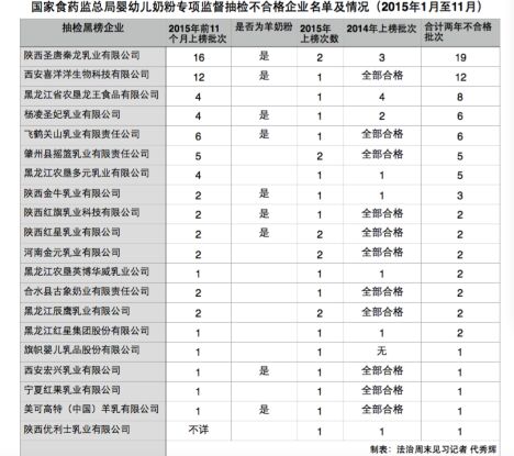 國家食藥總局針對嬰幼兒配方乳粉的專項監督抽檢結果顯示,圣唐乳業、楊凌圣妃乳業等羊乳企業多次因產品不合格上抽檢黑榜。