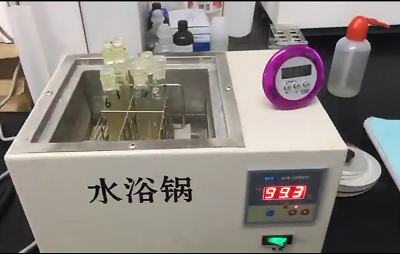 2. 把檢測管開蓋后放入沸水浴中的托架上加熱 5 分鐘后取出,上下搖動 6 次。