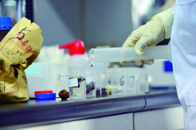 栗子皮取樣稱重后加入蒸餾水浸泡
