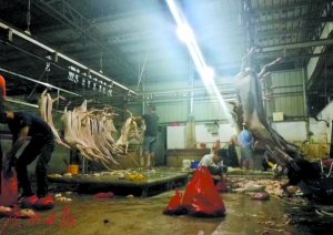 天氣漸冷,火鍋又熱,羊肉再走俏。然而,從屠宰場里出來、打著檢驗檢疫合格標志的羊肉,是不是就一定可以放心食用呢?昨天凌晨,記者暗訪發(fā)現(xiàn),在橋頭鎮(zhèn)盛景禽畜市場內(nèi)的屠宰場,動物檢驗檢疫形同虛設(shè)。