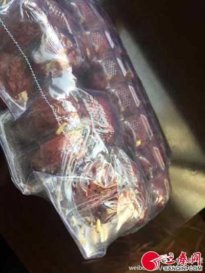 記者從該網(wǎng)友提供的照片看到,消費(fèi)者稱里面有蟲子的大棗品牌為“北方谷雨”狗頭棗,系陜西北方谷雨特產(chǎn)食品有限公司生產(chǎn)。透過透明包裝袋可以清楚的看到,數(shù)條白色的“蛆蟲”趴在大棗上。微博網(wǎng)友@淉淉7號(hào)告訴記者,她的同事暫時(shí)還沒有前去超市交涉,但后面肯定要去。