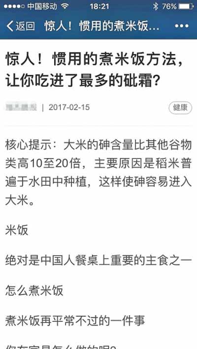 但是,該報道被國內一些媒體轉載后,一些微信公眾號便借此大做文章,把標題改成了“驚人!慣用的煮米飯方法,讓你吃進了最多的砒霜?”或者改成“實驗證明,中國人最常用的煮飯方式,居然砷殘留物最多”。