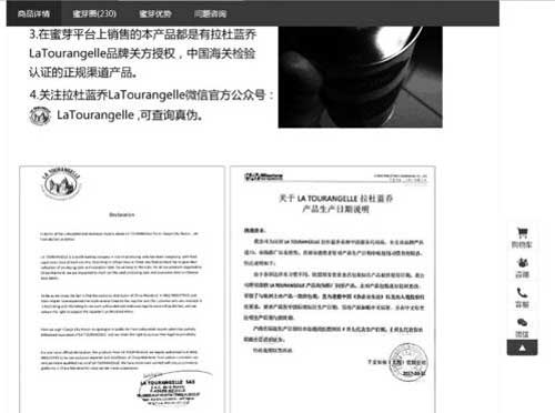 記者看到蜜芽網分別公布了廠家的英文版說明和代理商的中文版說明。千麥實業(上海)有限公司提供的產品日期說明顯示:由于各國法律及習慣不同,歐盟國家要求食品包裝標注產品最佳使用日期,該公司所引進的拉杜藍喬產品均為原廠同步產品,未對包裝進行任何更改,保留了與歐洲上市產品一致的包裝,且為遵循中國《食品安全法》以及出入境檢驗檢疫要求,要求產商按中國標準標注生產日期,另對產品加貼中文標簽,并在中文標簽注明生產日期與保質期。產商在標注生產日期時亦按通用慣例以P開頭代表生產日期,E 開頭代表保質期截止日以示區分。特此說明以答所惑。