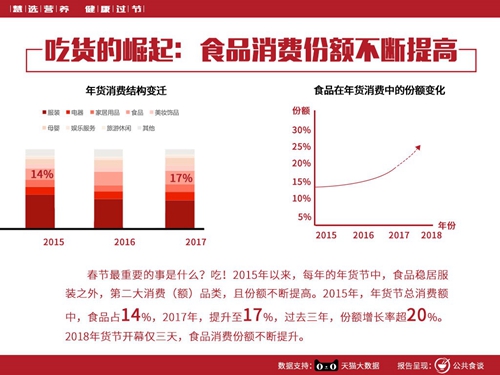 據科信食品與營養信息交流中心副主任鐘凱介紹,2015-2018天貓年貨節大數據顯示,食品一直是服裝之外,年貨節消費的第二大品類,且消費額占比不斷提升;公眾在線采購的食物種類,也日趨多樣化。