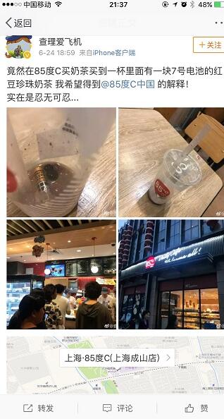 隨后,記者與85℃津味實(shí)業(yè)(上海)有限公司取得聯(lián)系。公關(guān)負(fù)責(zé)人王小姐表示,在接到消費(fèi)者投訴后,第一時(shí)間調(diào)閱了店員做飲品過程的監(jiān)控,并未發(fā)現(xiàn)有任何操作違規(guī)行為?!暗陠T都是嚴(yán)格按照標(biāo)準(zhǔn)流程執(zhí)行,電池基本不可能會(huì)出現(xiàn)在操作臺?!蓖跣〗惚硎?,珍珠和紅豆都是需要現(xiàn)煮的“用大鍋煮原料,根本用不到電池,電池也不可能混入?!绷硗猓€強(qiáng)調(diào),消費(fèi)者是透過外賣平臺訂的奶茶,并不是第一時(shí)間在店里發(fā)現(xiàn)有電池存在,中間存在太多變數(shù)?!氨局屜M(fèi)者滿意的態(tài)度,店家才會(huì)提出以一賠十的補(bǔ)償。對張小姐的遭遇,我們也深感抱歉?!?